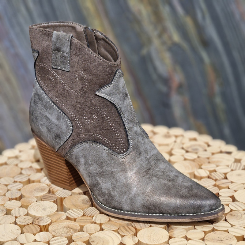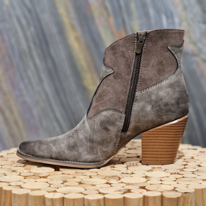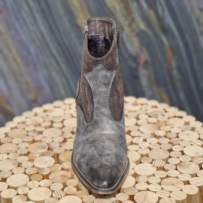 Santiag bi-matière, en nubuck marron et aspect brossé gris. A talon carré de 7 cm. Forme pointue sur le devant, et découpe arrondie sur le haut de la chaussure. Doublé chaud à l'intérieur. Avec fermeture éclair intérieur.