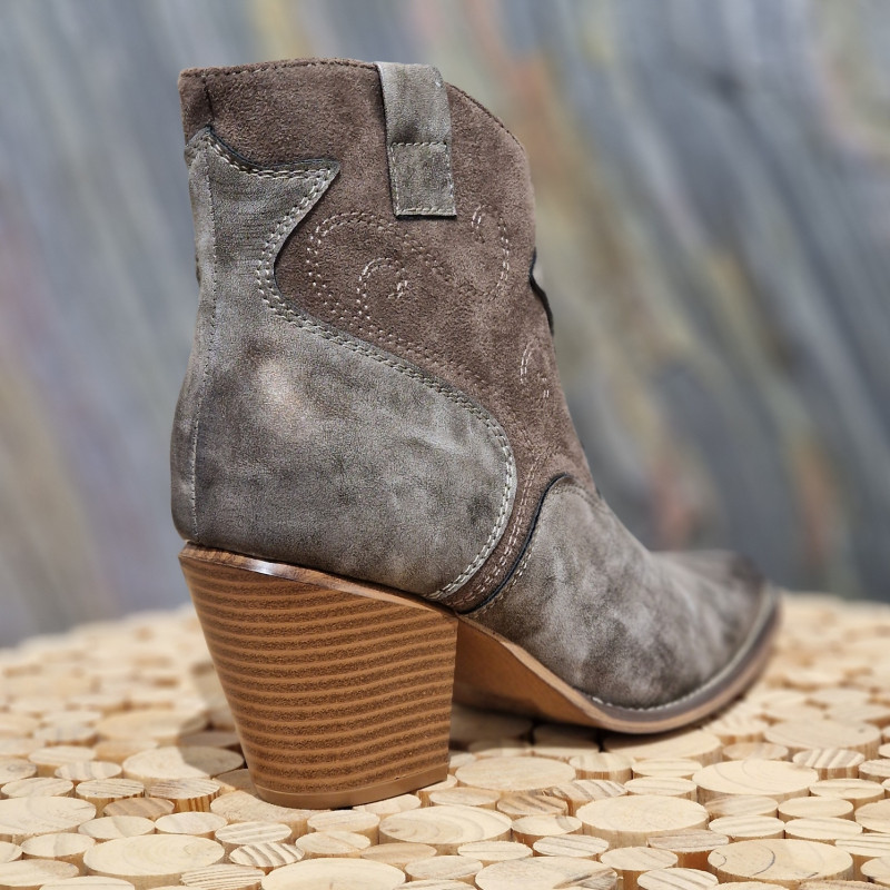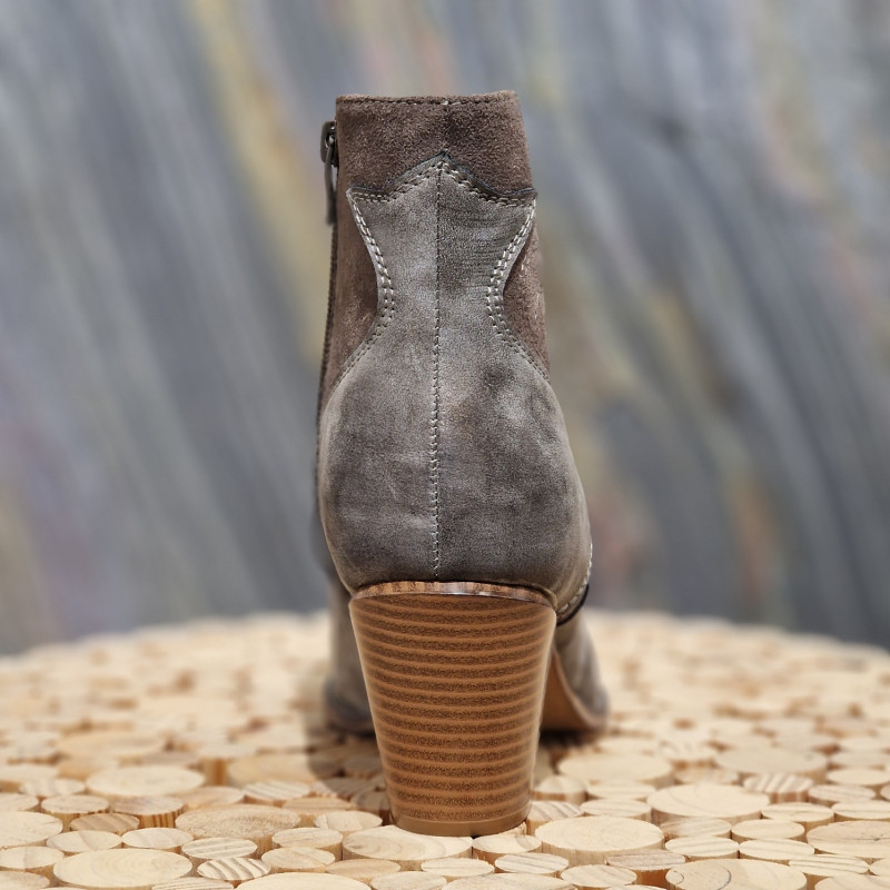 Bottine Santiag bi-matière, en nubuck marron glacé et aspect brossé taupe. A talon carré de 7 cm.
