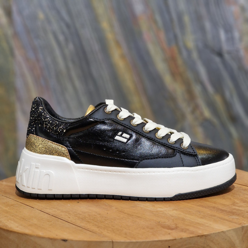 Le modèle Court D.Franklin est fabriqué avec une teinte dorée et un talon à imprimé animal. Ils ont une semelle grise contrastante avec le logo embossé à la fois sur le talon et sur la semelle. Ils ont également le drapeau brodé sur le côté. Avec une hauteur de 4 cm et une semelle en phylon pour un amorti léger. La semelle anatomique est également amovible.