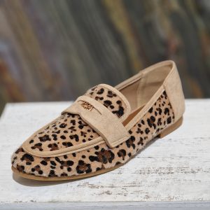 Mocassin léopard avec du beige sur le haut et sur l’arrière.