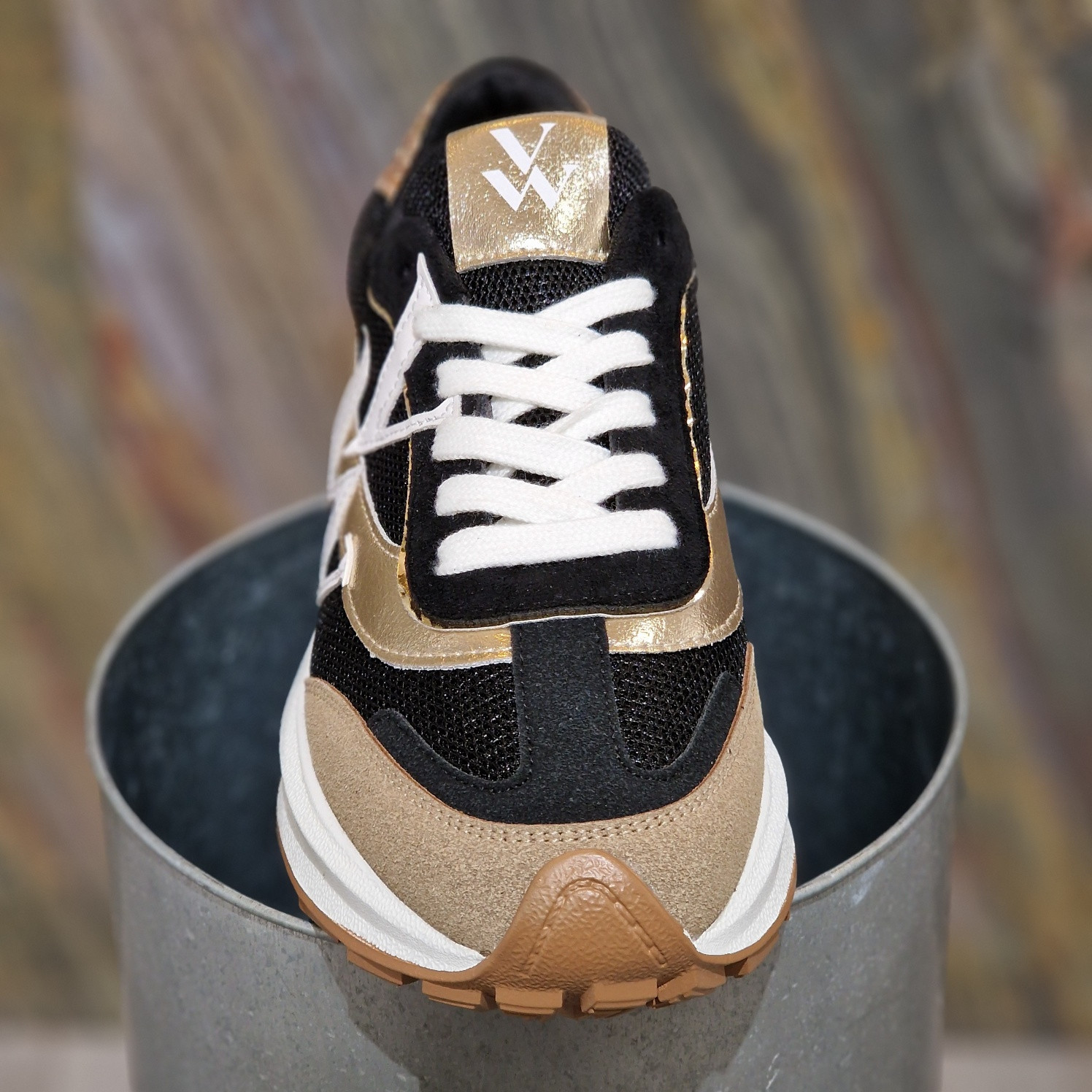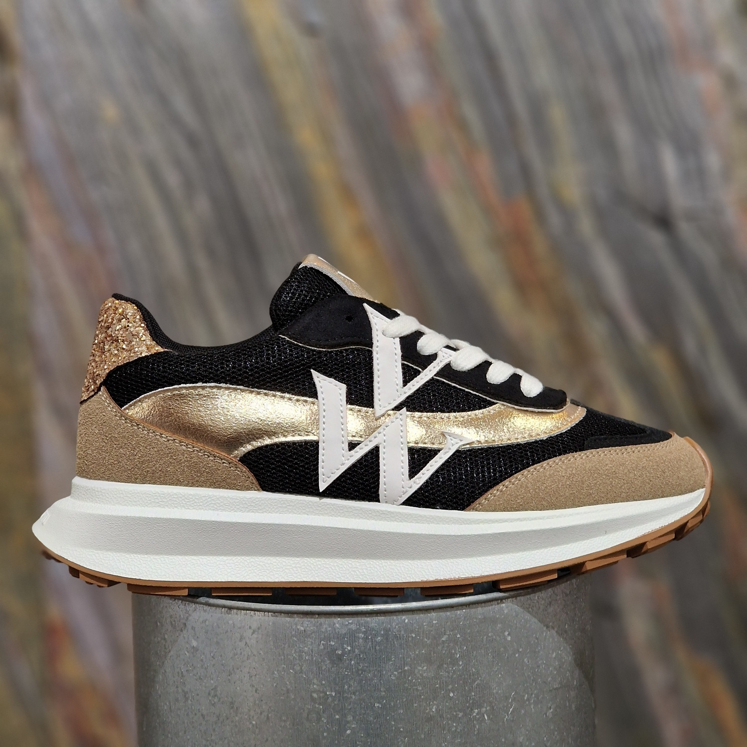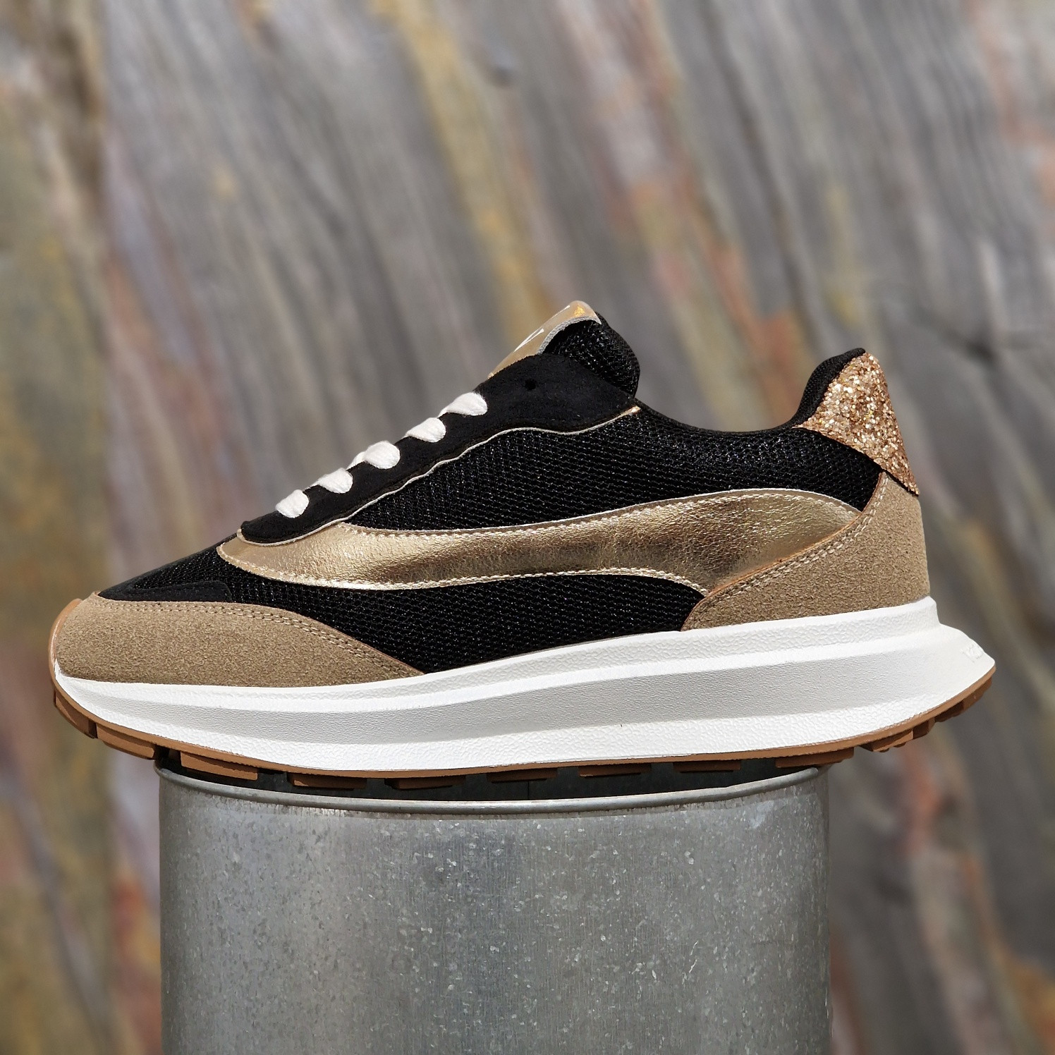 - Empiècement en similicuir texturé or et en suédine effet daim fendu noire