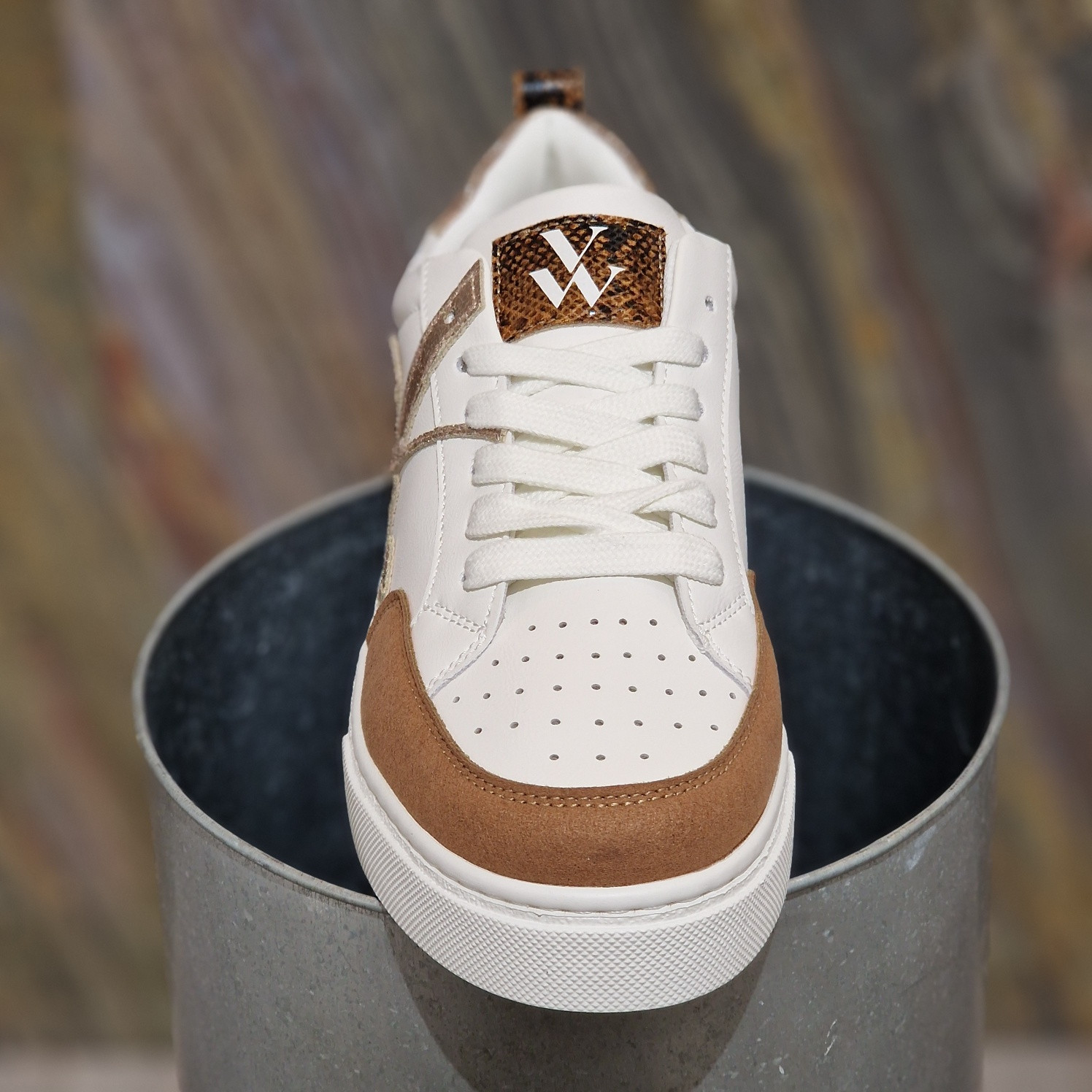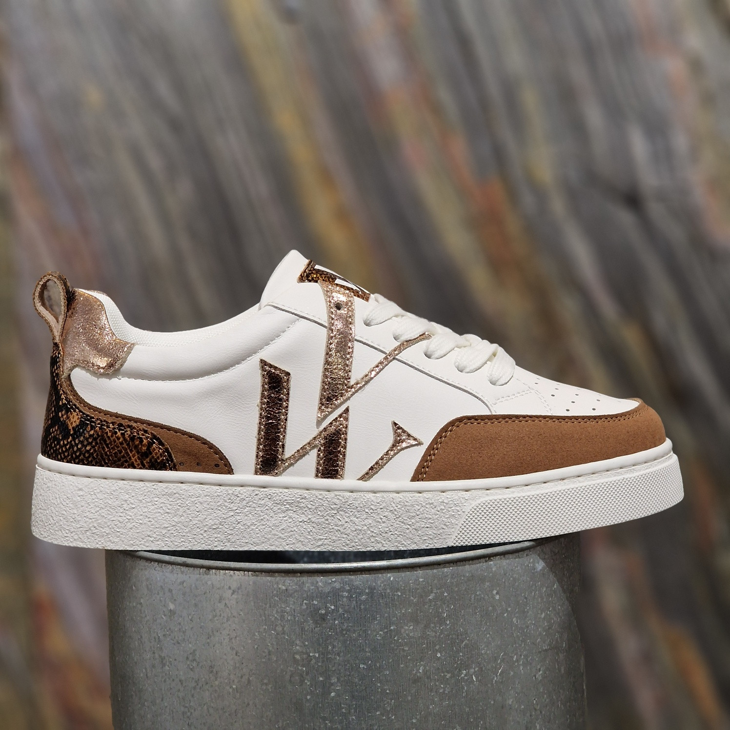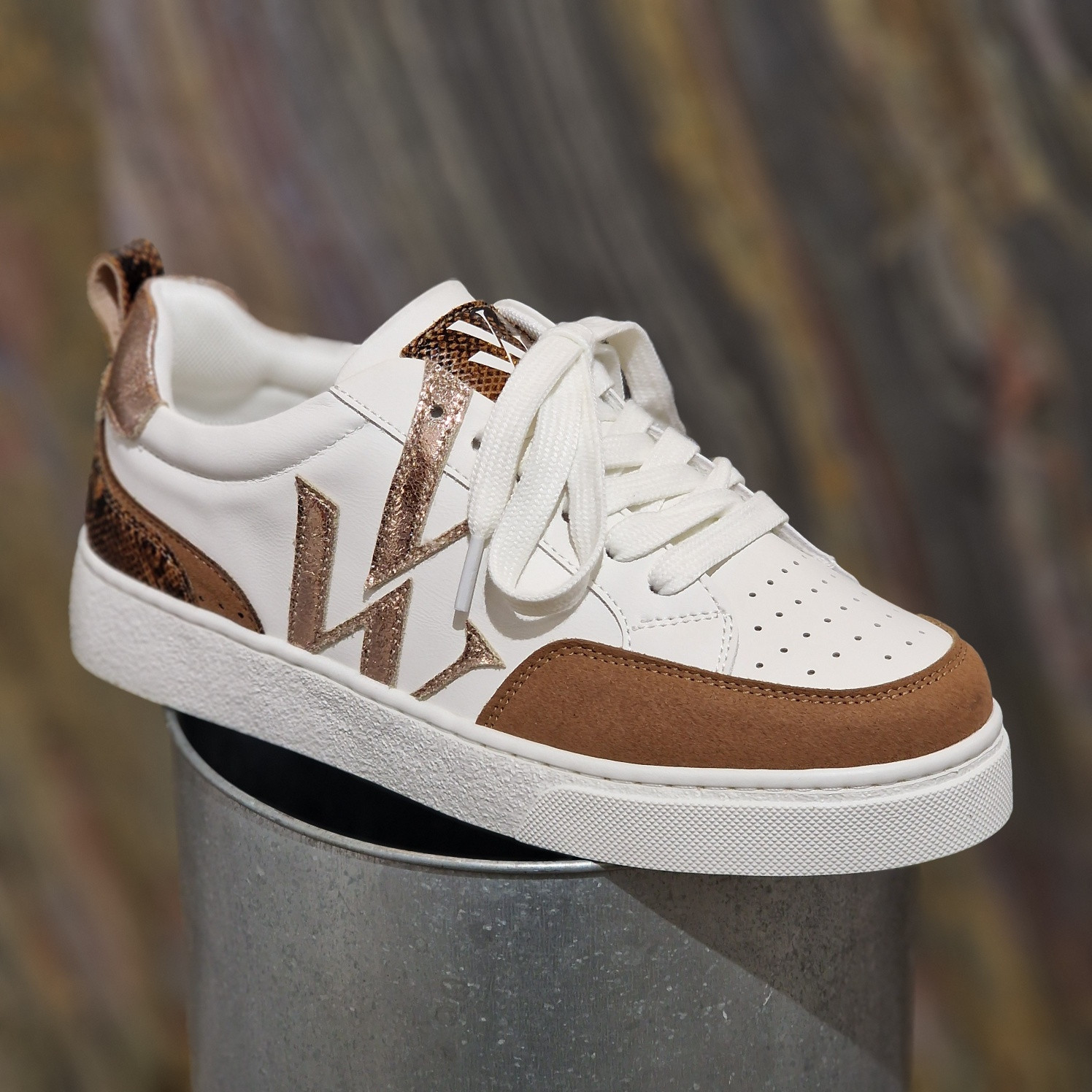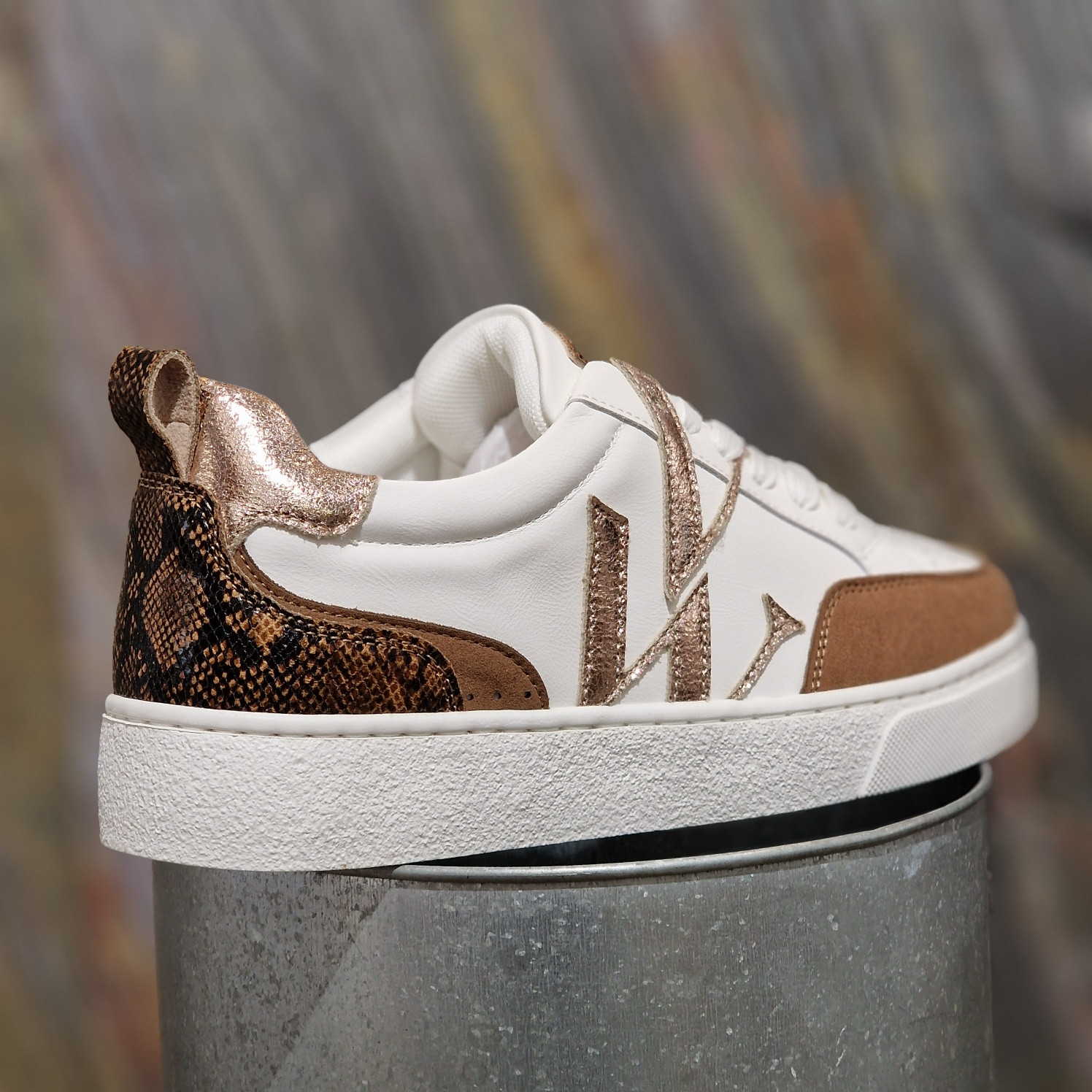 Basket Mona monogramme, beige et brique, à semelle running de chez VANESSA WU.