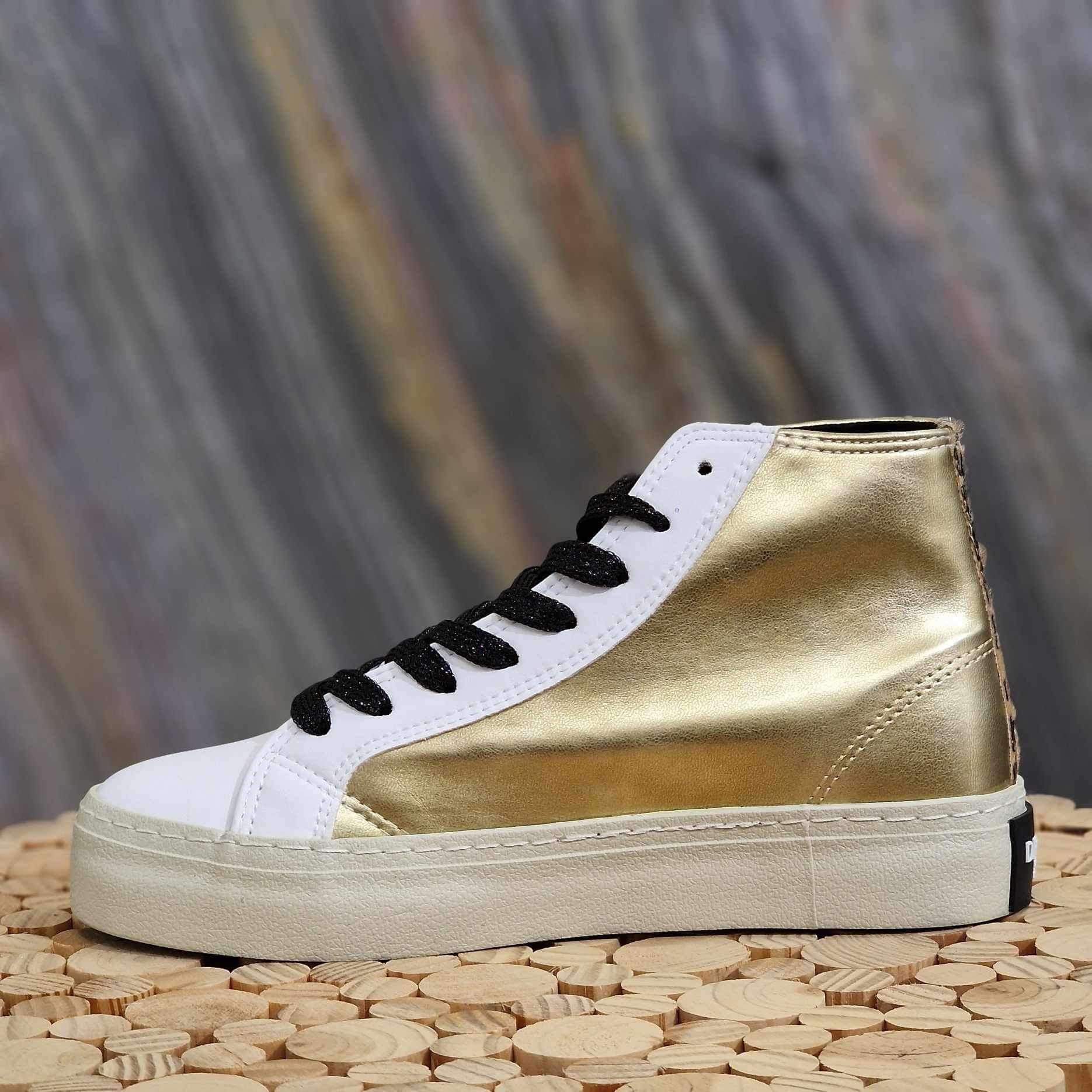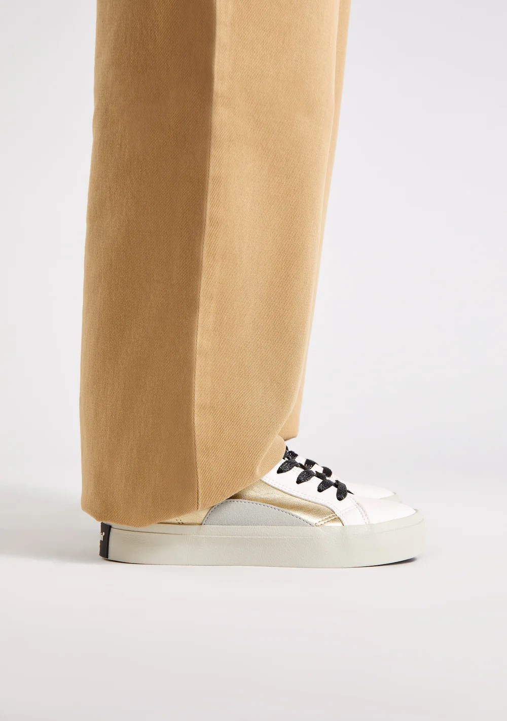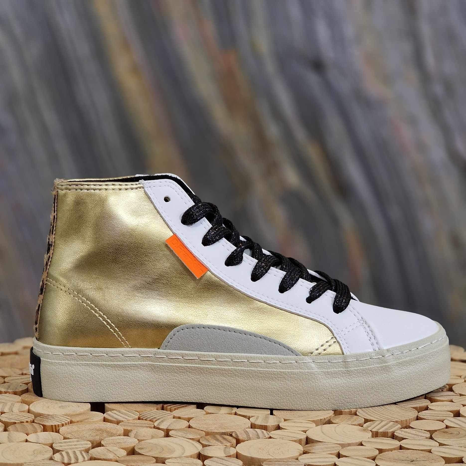 Baskets montantes aux détails brillants. Un design aux finitions métalliques inspiré des couleurs cosmiques.Le modèle Half Moon capture l'esthétique stellaire en combinant des textures brillantes en or, des tons blancs et un imprimé léopard. Il présente une tige matelassée et une fermeture à lacets noire. Il présente également un lettrage personnalisé sur le côté et le talon. Elle présente également un lettrage personnalisé sur le côté et le talon, ainsi qu'un détail en forme de demi-lune en gris.Elle est dotée d'une texture effet daim sur le bout du pied et d'une semelle en caoutchouc vulcanisé pour une adhérence parfaite.Caractéristiques :
