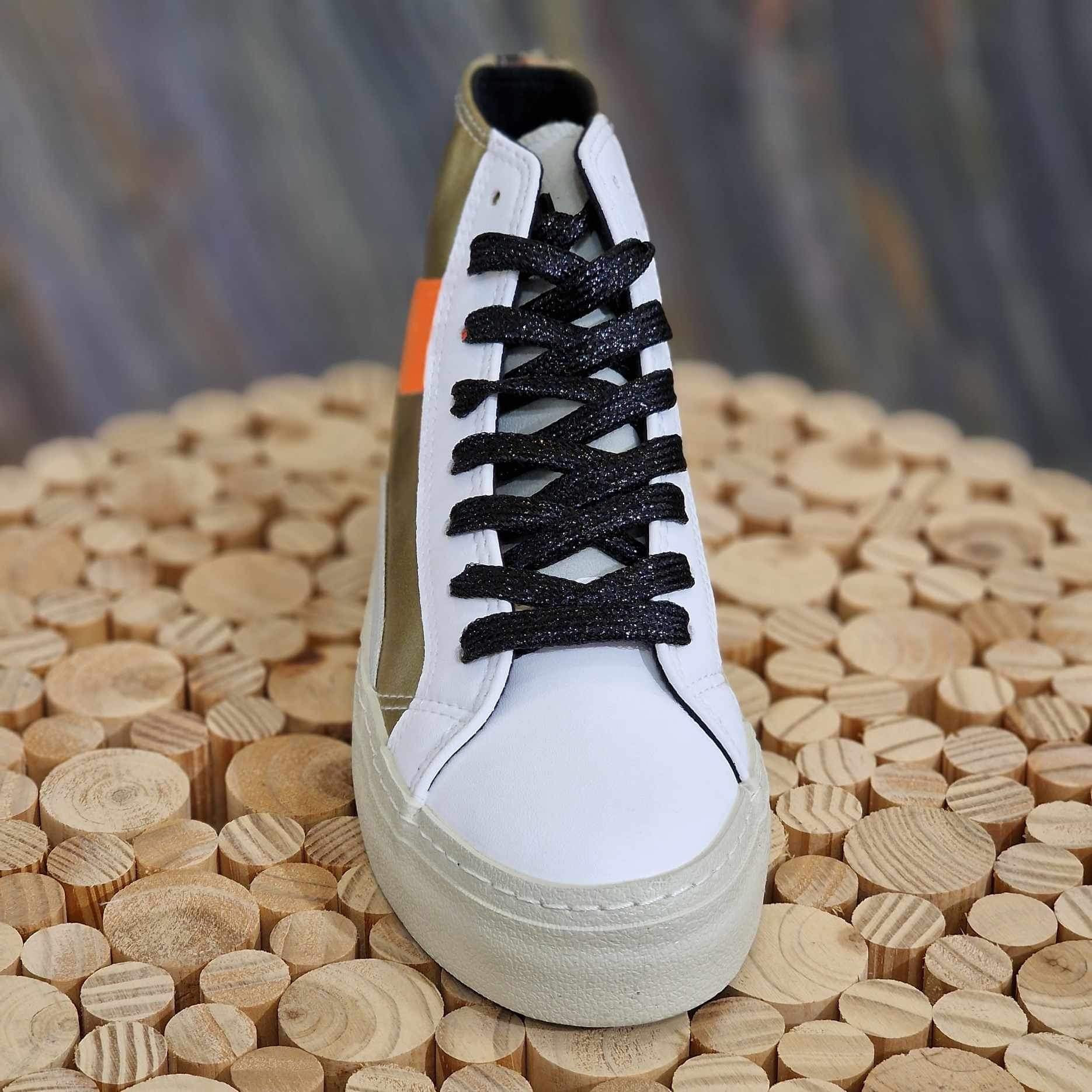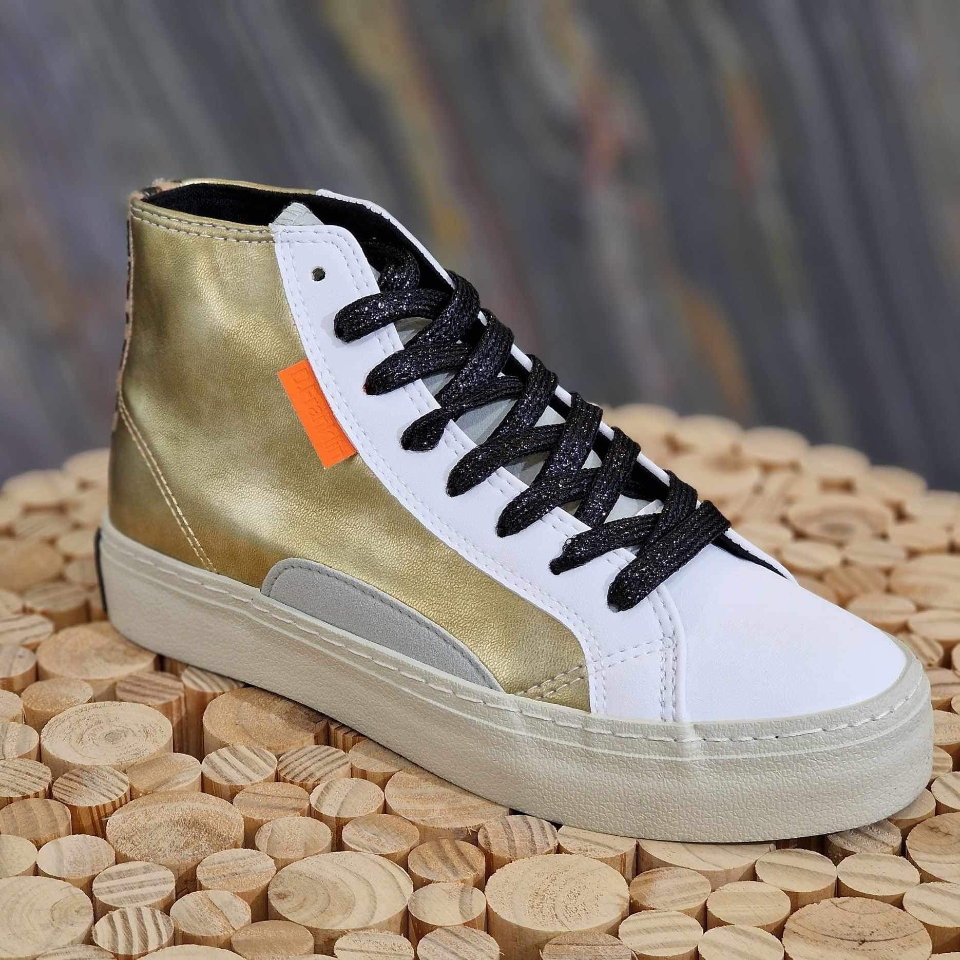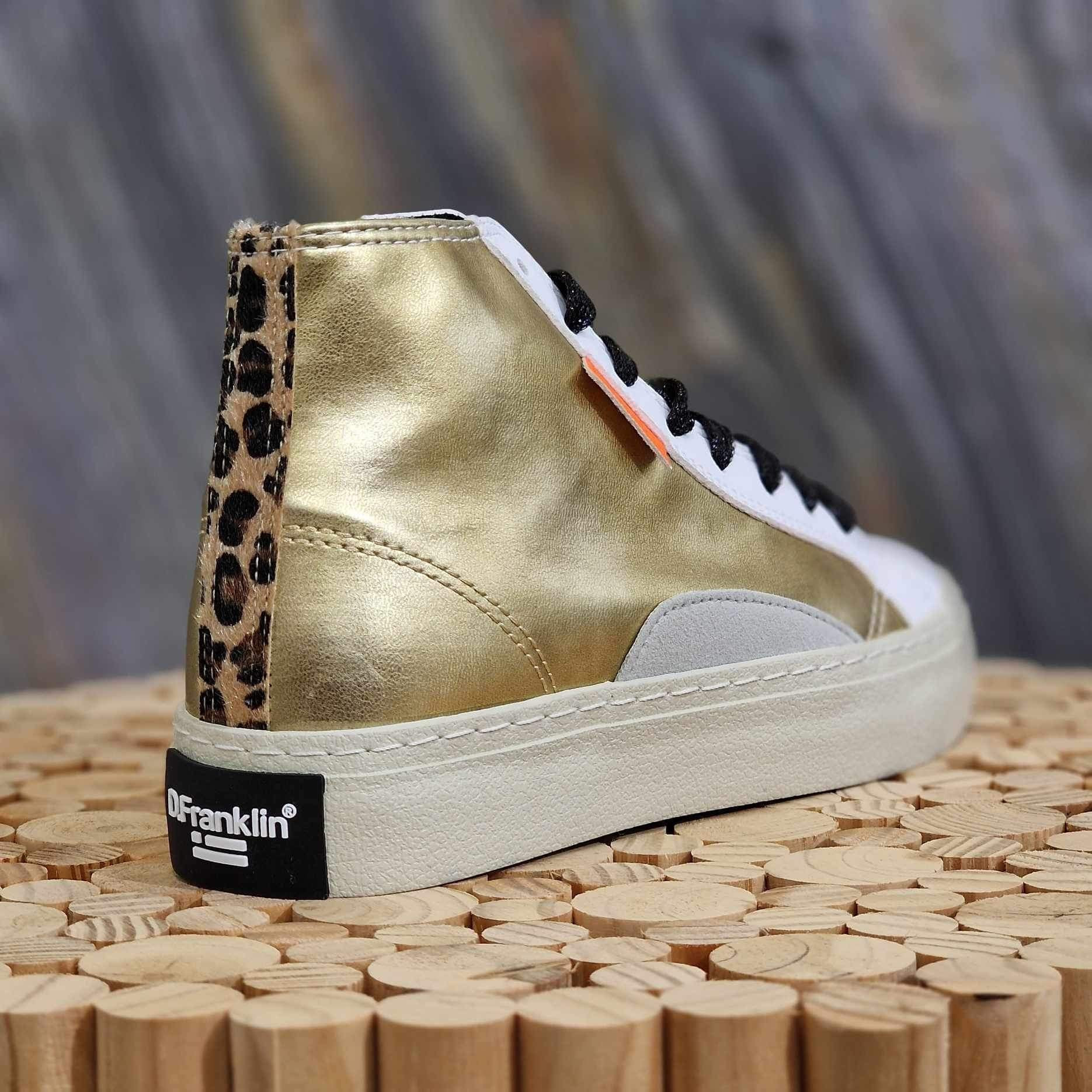 Baskets montantes aux détails brillants. Un design aux finitions métalliques inspiré des couleurs cosmiques.Le modèle Half Moon capture l'esthétique stellaire en combinant des textures brillantes en or, des tons blancs et un imprimé léopard. Il présente une tige matelassée et une fermeture à lacets noire. Il présente également un lettrage personnalisé sur le côté et le talon. Elle présente également un lettrage personnalisé sur le côté et le talon, ainsi qu'un détail en forme de demi-lune en gris.Elle est dotée d'une texture effet daim sur le bout du pied et d'une semelle en caoutchouc vulcanisé pour une adhérence parfaite.Caractéristiques :