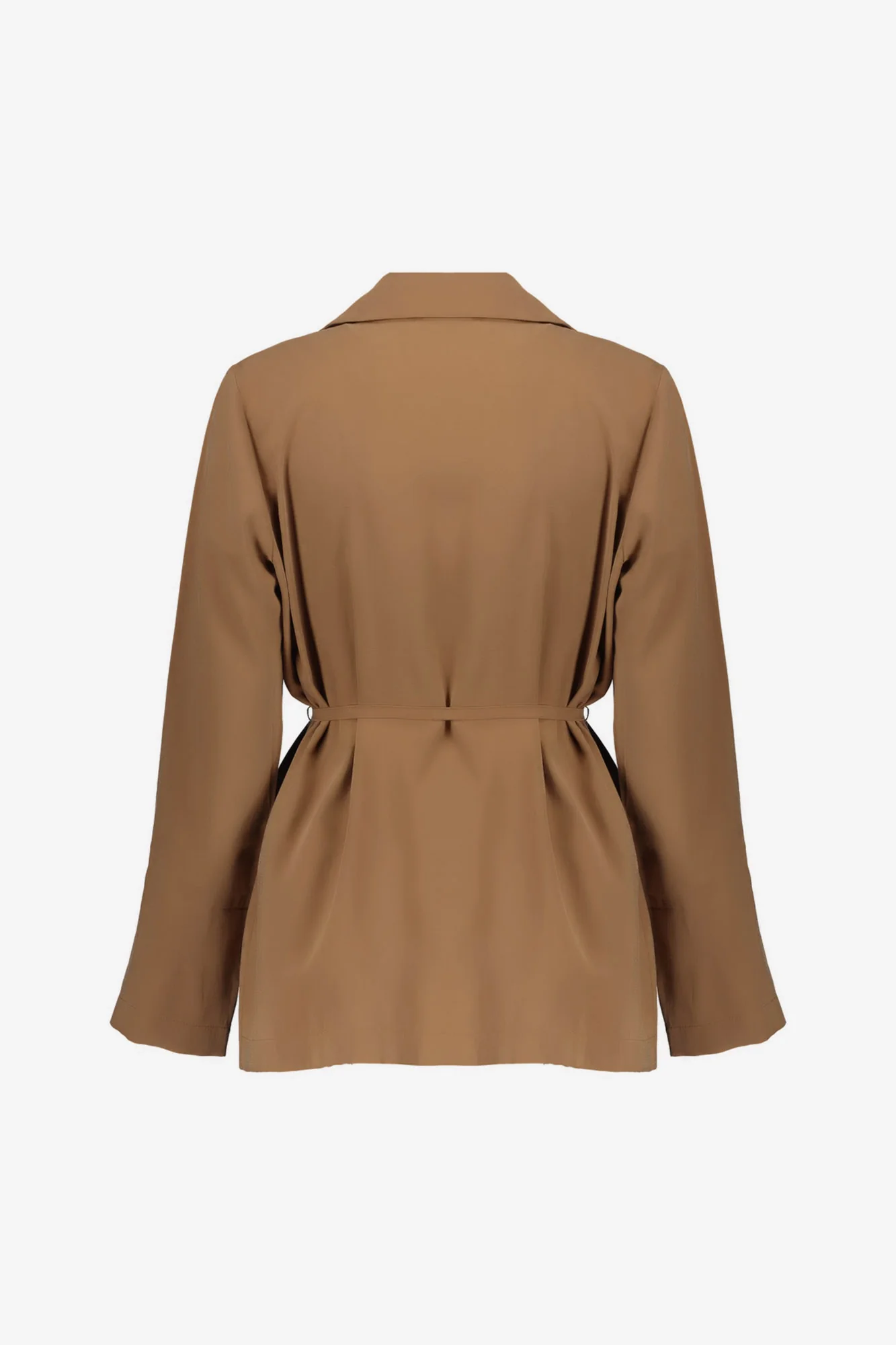 Ce blazer de notre collection S26-1, d'un brun chaud et riche, fait partie d'un ensemble coordonné élégant. Son col à revers, son décolleté en V profond et sa ceinture à nouer soulignent la taille avec élégance. Son tissu doux est agréable à porter et convient aussi bien aux occasions professionnelles qu'aux soirées chics.Col à revers,