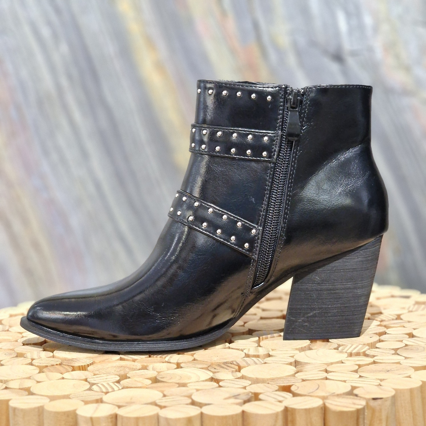 Bottine noire à clous argentés, avec brides argentées sur le côté. Talon carré de 7 cm. Forme pointue sur le devant avec fermeture éclair intérieur.