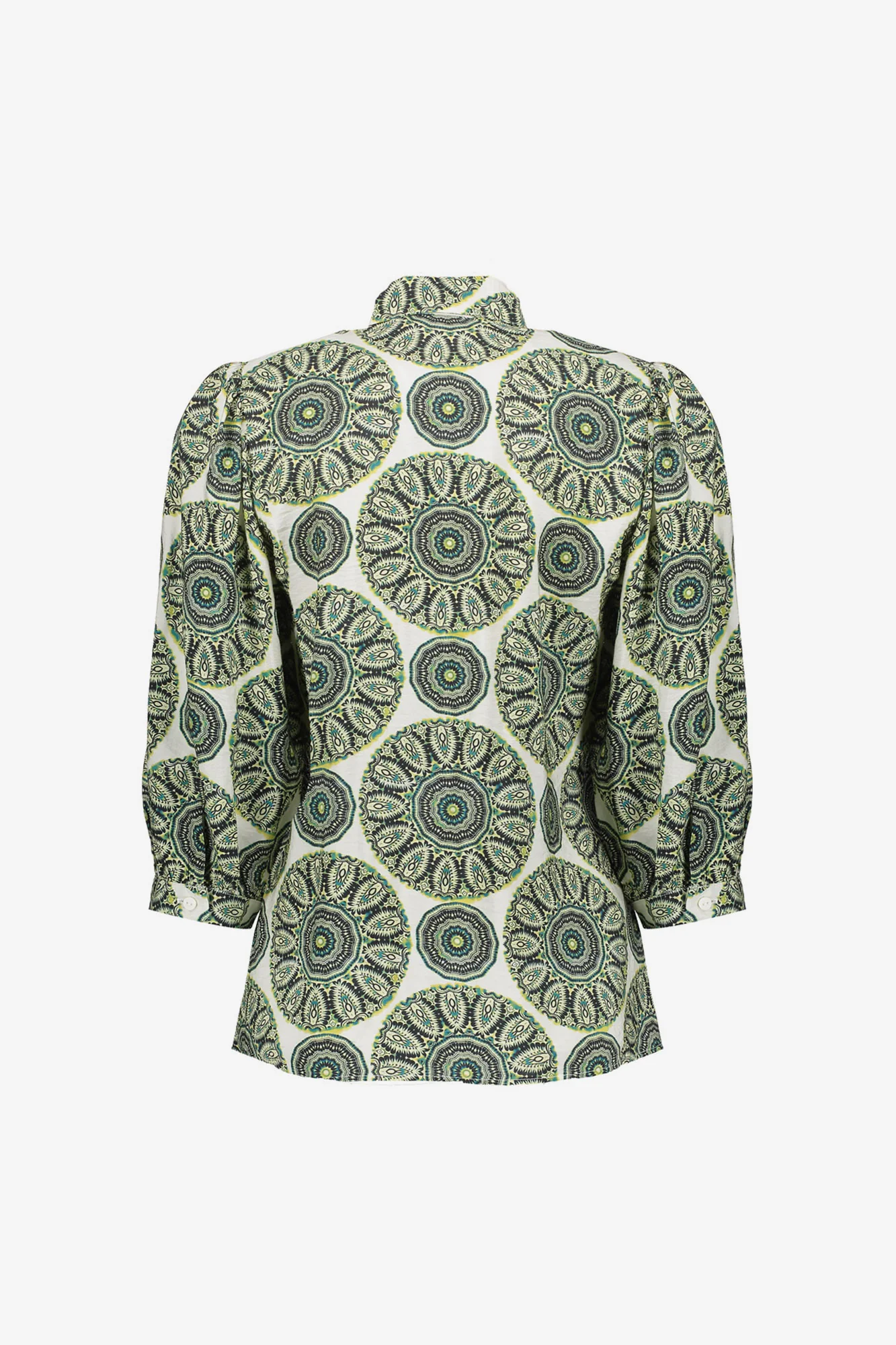 Ce chemisier de notre collection S26-1 arbore un élégant imprimé graphique de paon qui évoque instantanément l'été. Son tissu doux et confortable en fait une pièce idéale pour la saison estivale. Associez-le au pantalon vert de la même collection pour une tenue coordonnée, parfaite pour une journée de travail estivale.Coupe droite et ample