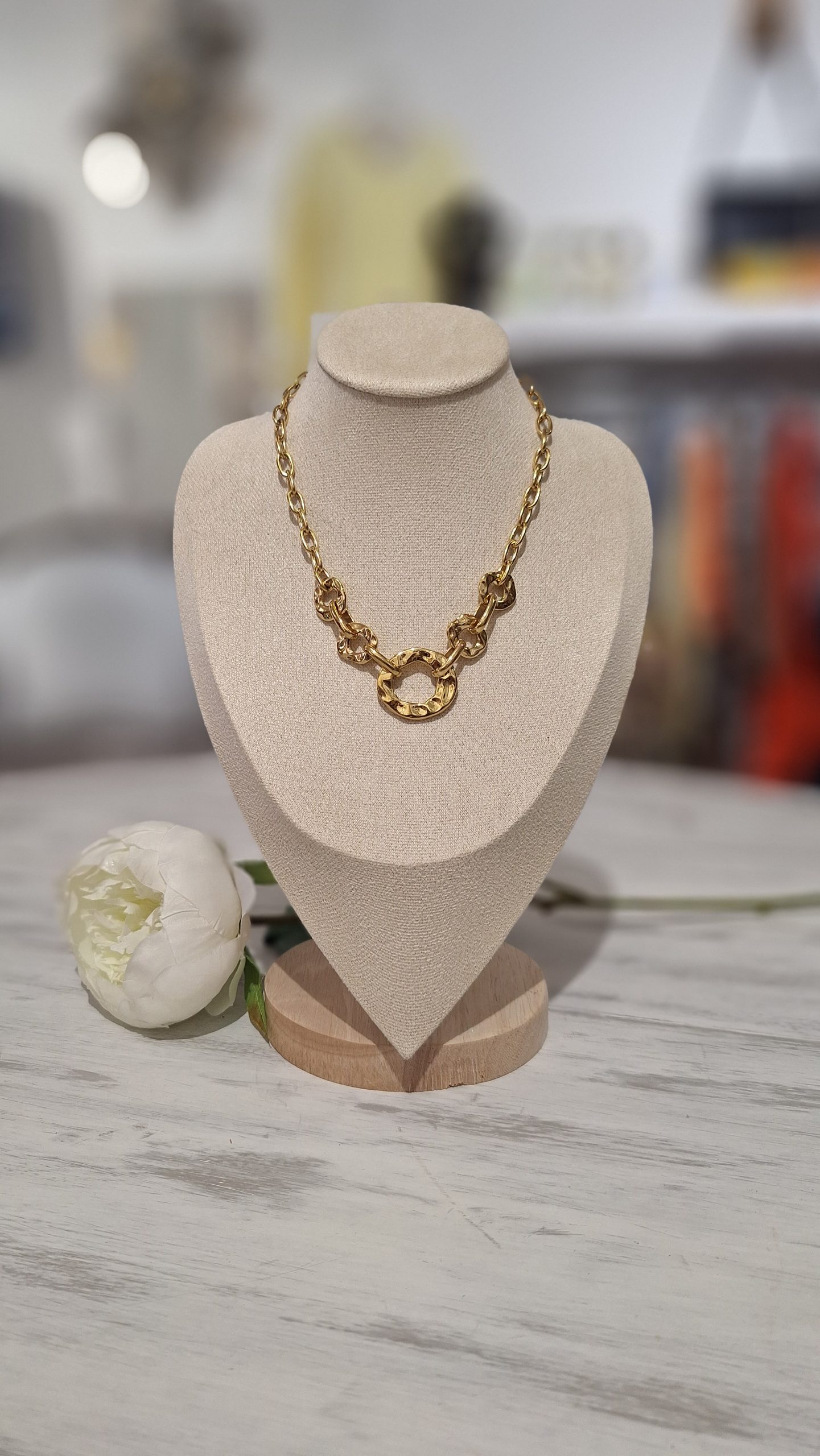 Apportez une touche contemporaine et raffinée à votre look avec ce collier en acier orné de maillons martelés. Chaque maillon présente une texture subtile qui capte la lumière et ajoute du relief, offrant un style à la fois chic et moderne.