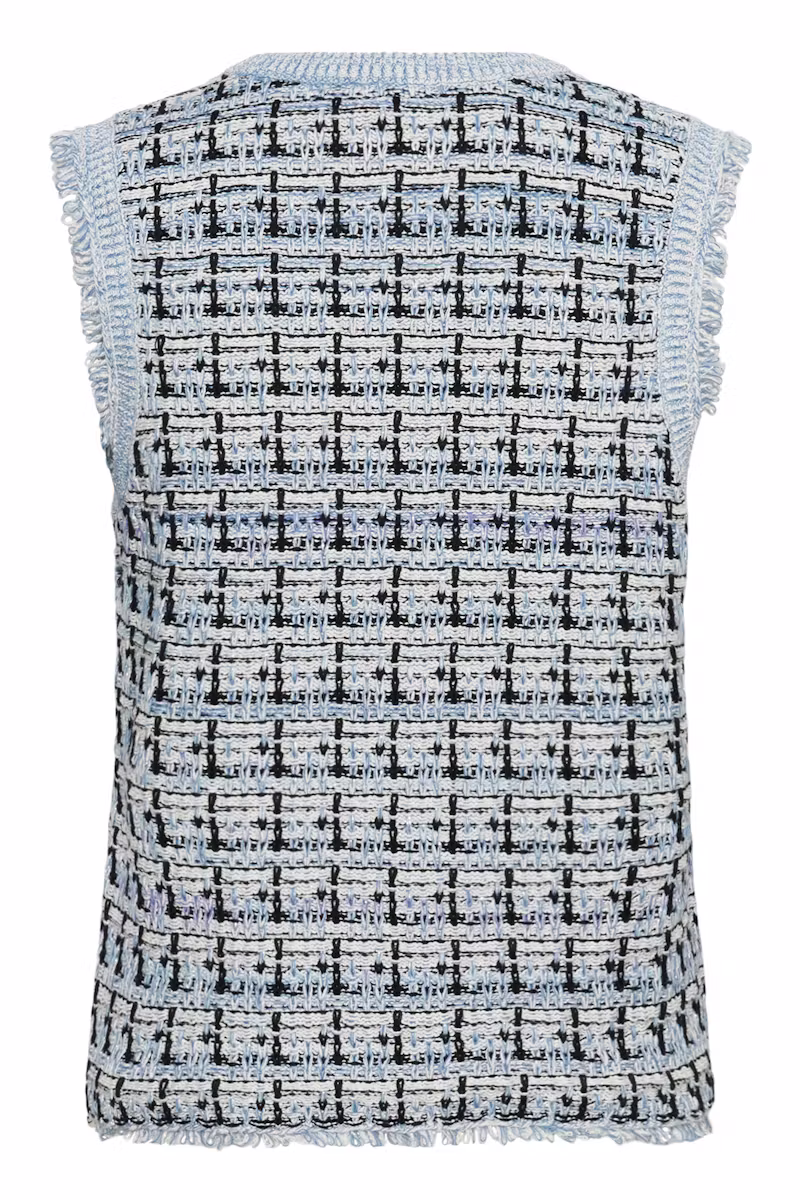 Top sans manches en tweed à encolure ronde. Coupe droite, finitions frangées aux emmanchures et à la base pour une allure structurée et moderne.