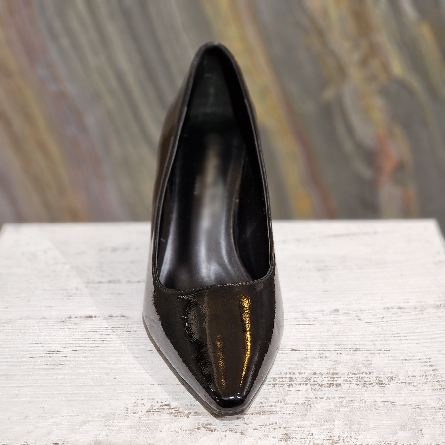 Escarpin vernis noir, à bout pointu. A talons de 7,5 cm.