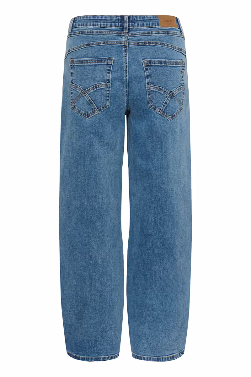 Jean à coupe large, jambe droite et allure décontractée, grandes poches plaquées devant, taille classique, passants et effet moucheté subtil.