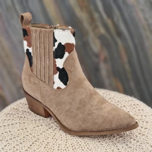 Boots en nubuck taupe avec imprimé vache sur le haut de la chaussure.