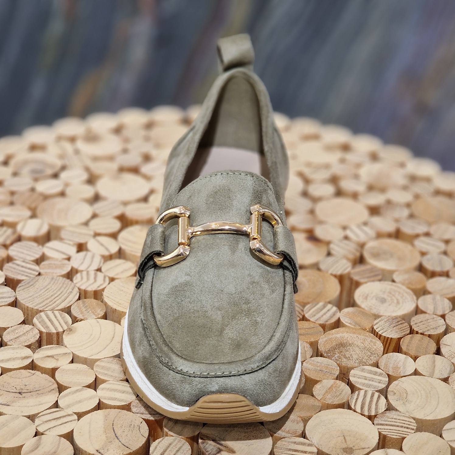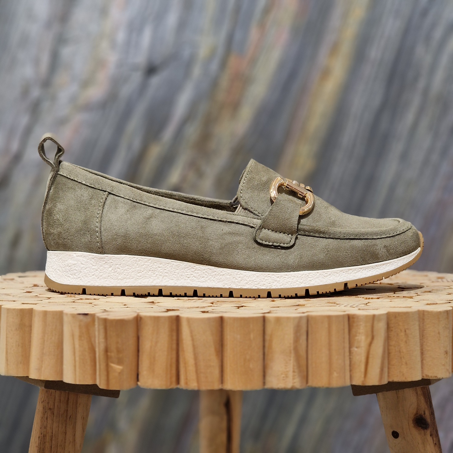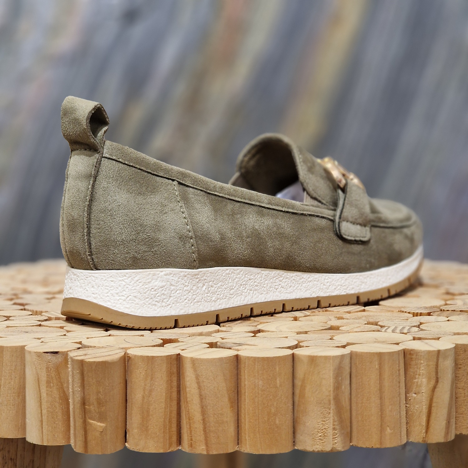 Ce mocassin kaki séduit par son toucher doux et son style intemporel. Sa teinte naturelle, facile à associer, apporte une touche de modernité tout en restant discrète et élégante.