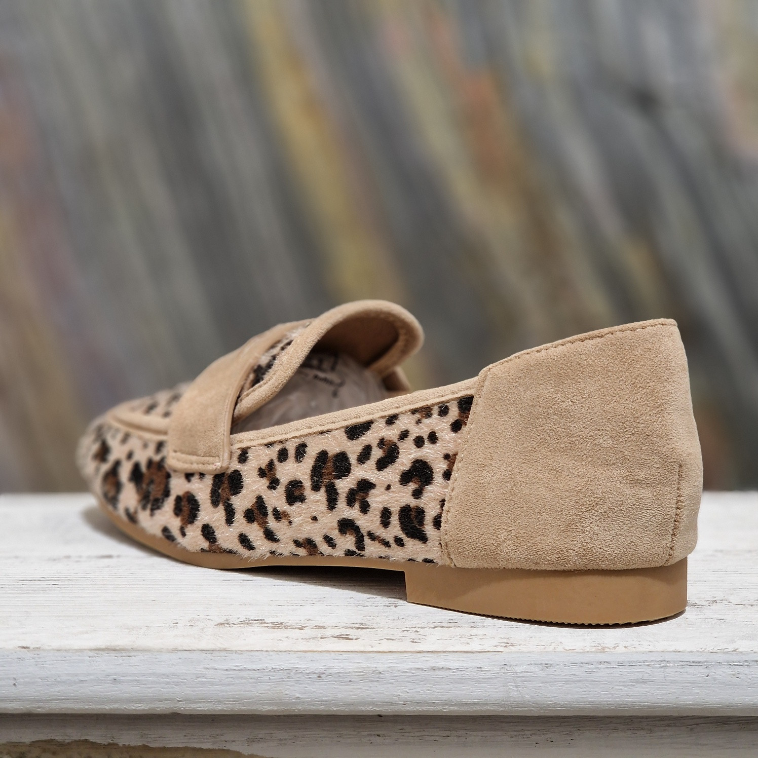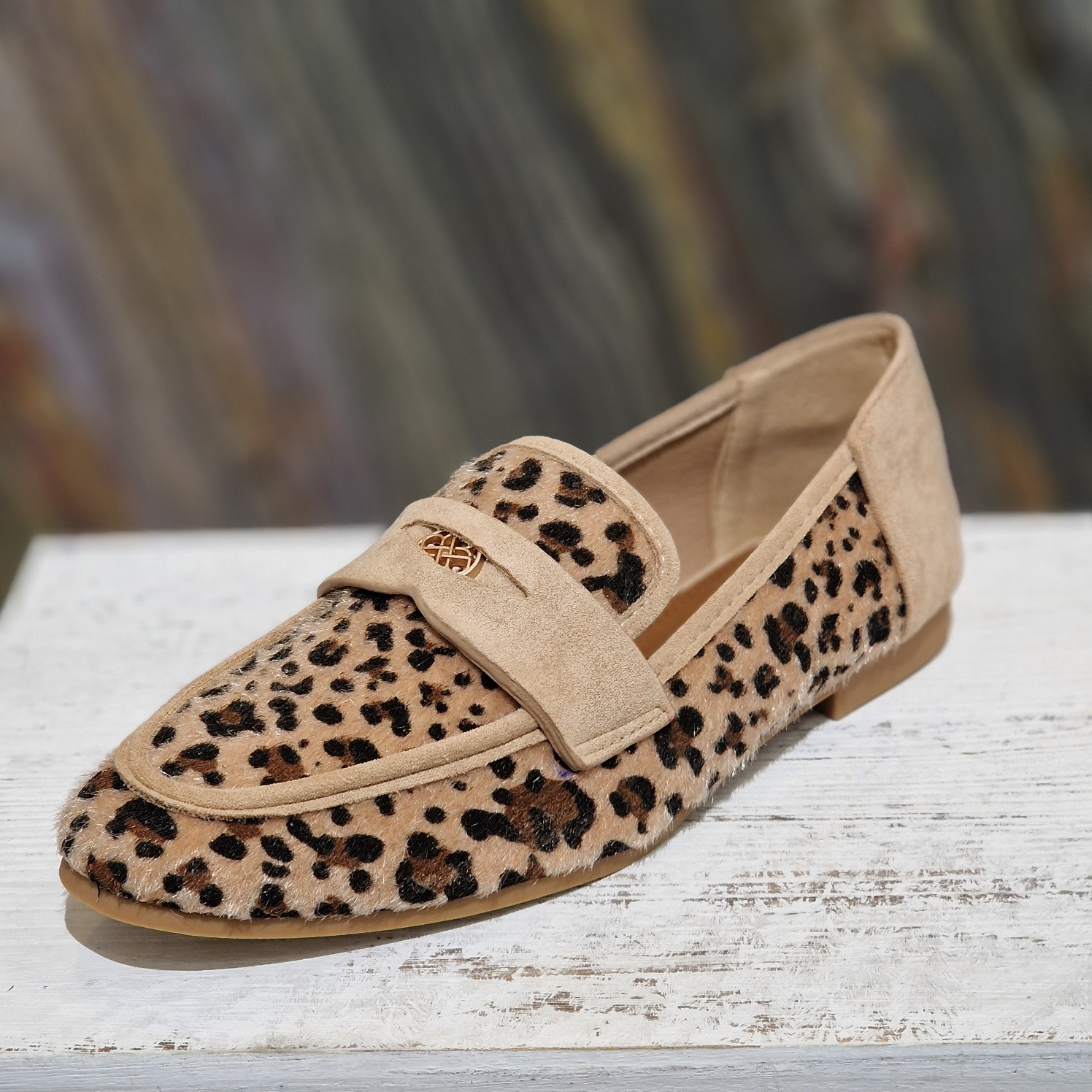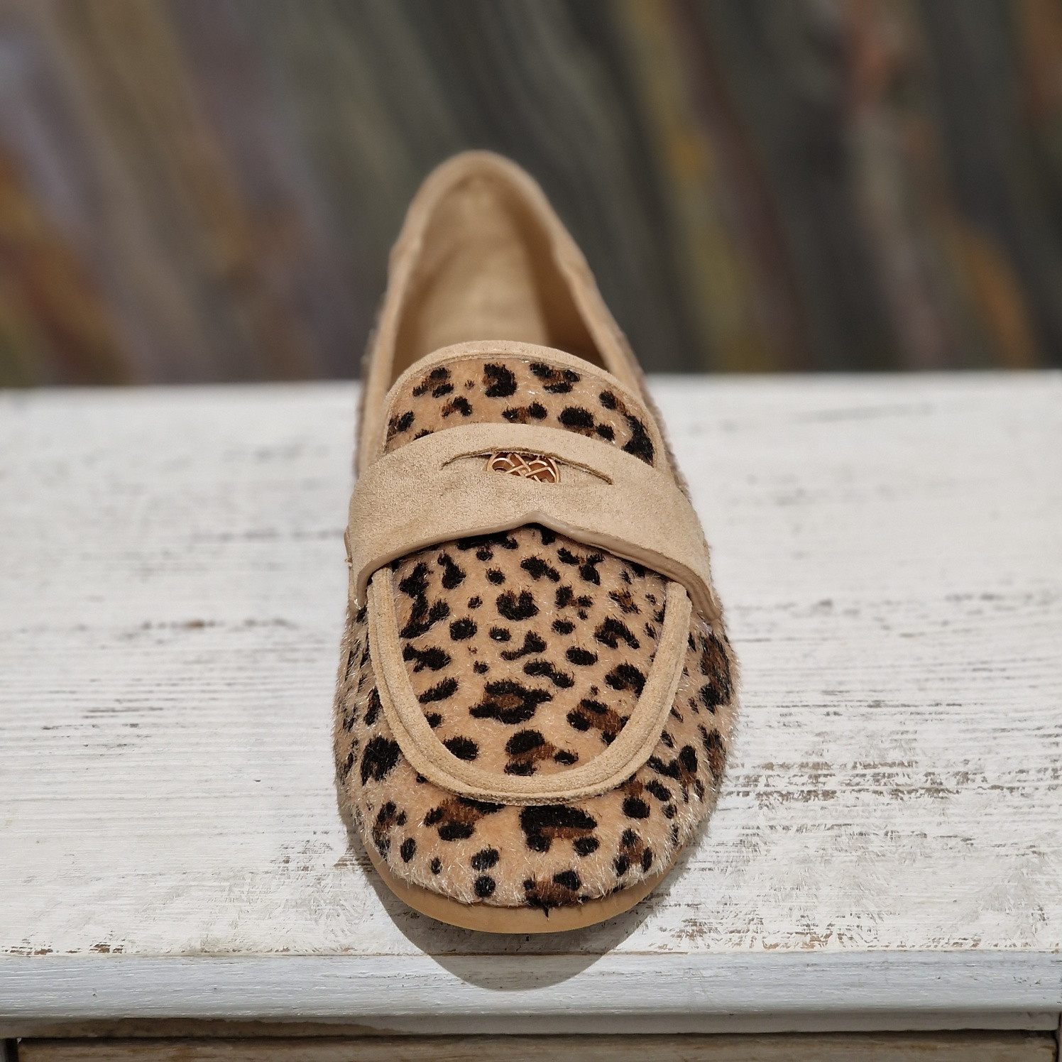Mocassin léopard, avec bride assorti en nubuck beige sur le haut et l'arrière de la chaussure.