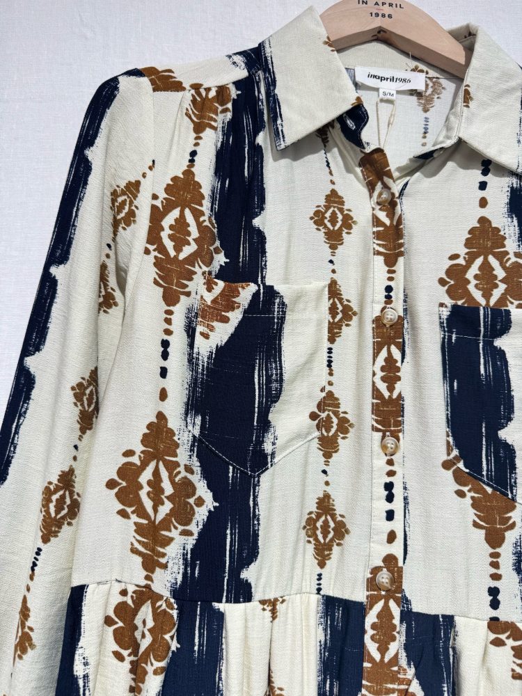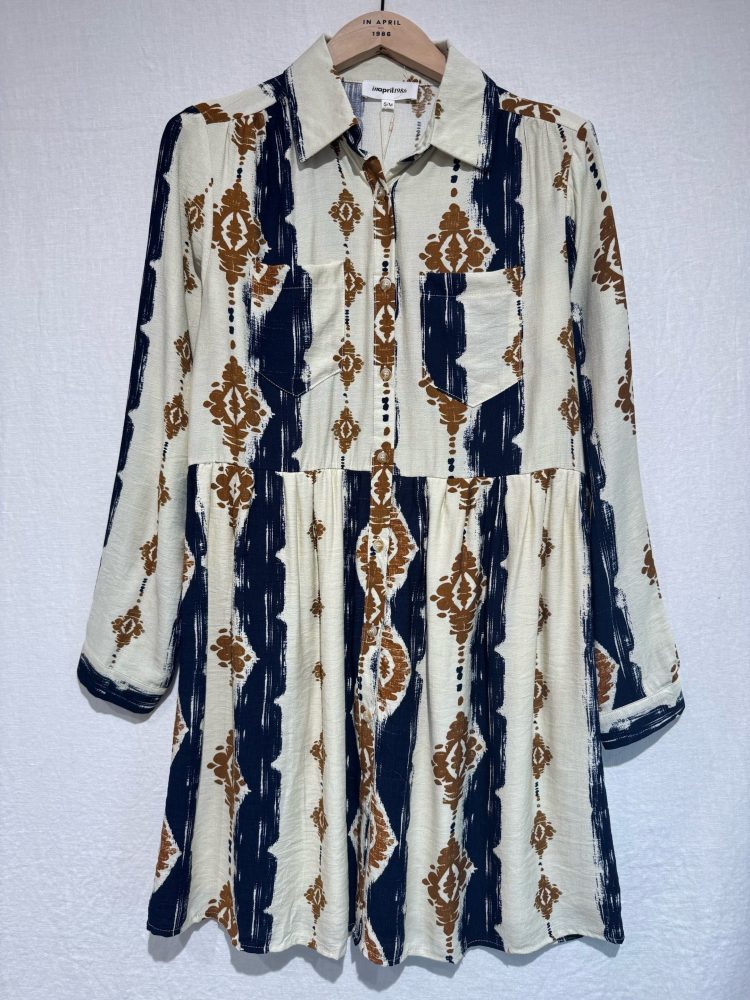 Robe courte marine et camel au style bohème, sublimée par un col chemise qui apporte une touche structurée et élégante. Son mélange de couleurs chaleureux et sa coupe fluide offrent un tombé léger et féminin. Facile à porter au quotidien, elle se marie aussi bien avec des bottines qu’avec des sandales pour un look bohème chic plein de caractère.