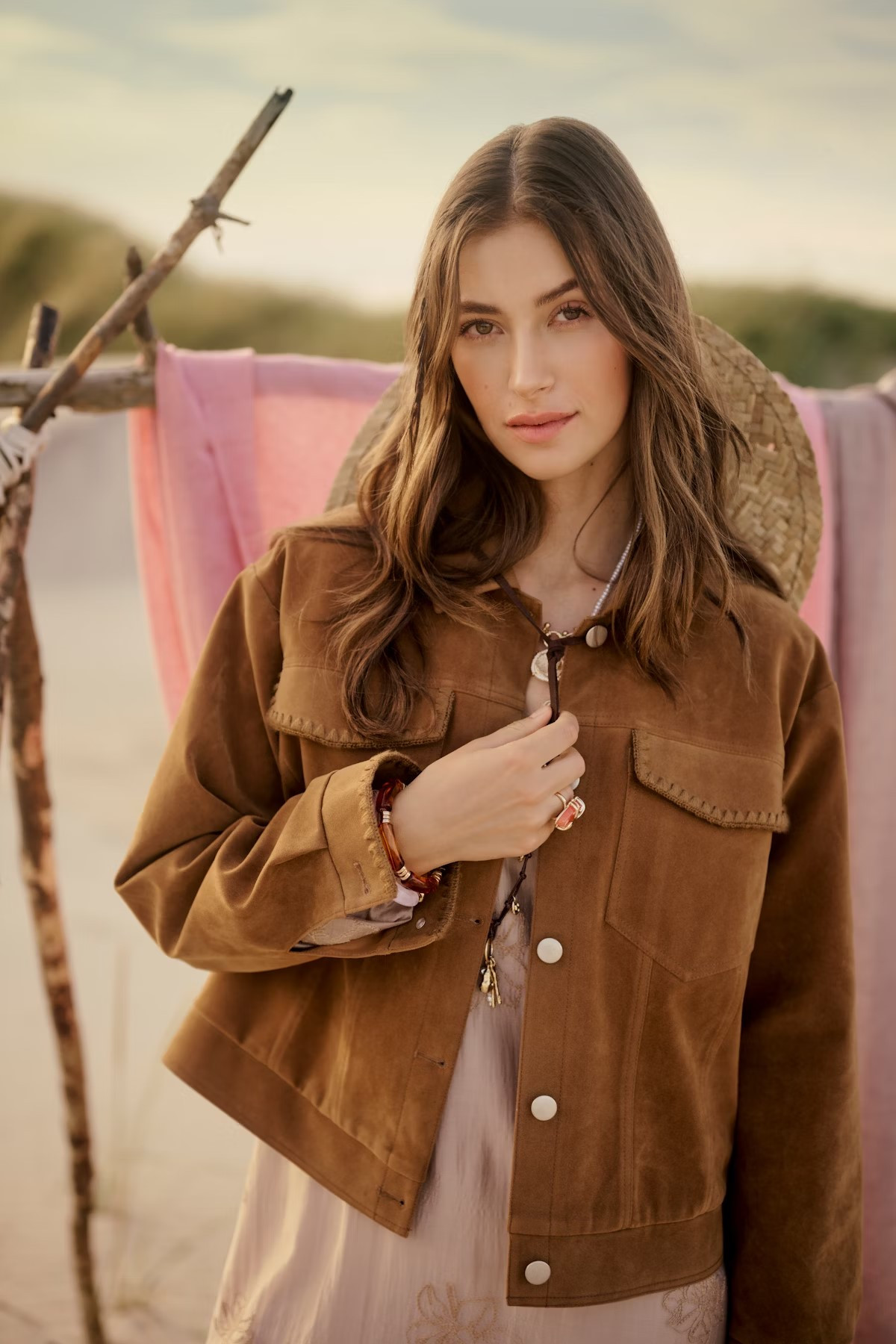 Cette veste casual en cuir velours a une coupe décontractée avec un col chemisier classique. Elle a deux poches à rabat avec détails dessus. Une patte de boutonnage avec des boutons mais également de belles manches avec finitions aux poignets. Parfaite pour un style polyvalent et confortable.