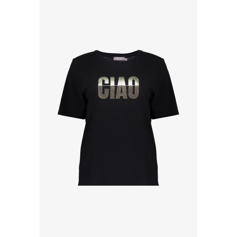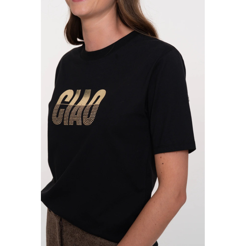 T-shirt noir avec écriture "Ciao" doré et clous assortis de chez Geisha.